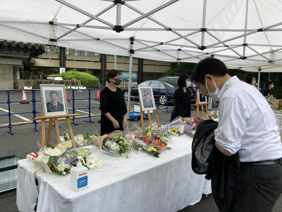 東京出張がありましたので、帰りに亡安倍元首相の献花台と記帳台に参列し、記帳等をしてきました。元首相のご冥福を心から祈りすると共に、このような事件が再度起こることがないよう、後に残る私たちが誓いを新たにすべきだと考えて記帳等をさせていただきました。事件の被疑者について、いろいろ報道がされていますが、どのような理由であっても、今回の事件を正当化することは出来ません。そして、模倣犯が出ないことが強く望まれます。会場は参列者が多く、むし暑い会場で自分の番がくるまで待ちましたが、その間、いろいろなことを考えさせられました。