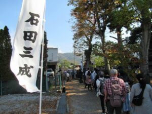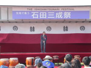 長浜市石田町で盛大に行われました。大変な数の人が来られました。車は県外ナンバーも多く、石田三成公の人気の高さを示しました。大河ドラマは、今日石田三成公の挙兵、関ヶ原合戦に東軍が向かうといった場面のようです。いずれ、石田三成公の大河ドラマが実現するようがんばります。それを目指した三成サミットでは、石田三成公を描いた「8本目の槍」の著者で直木賞作家の今村翔吾さんをお迎えして、12月2日14時~湖北文化ホールで講演会を開きます。是非おいで下さい。