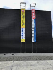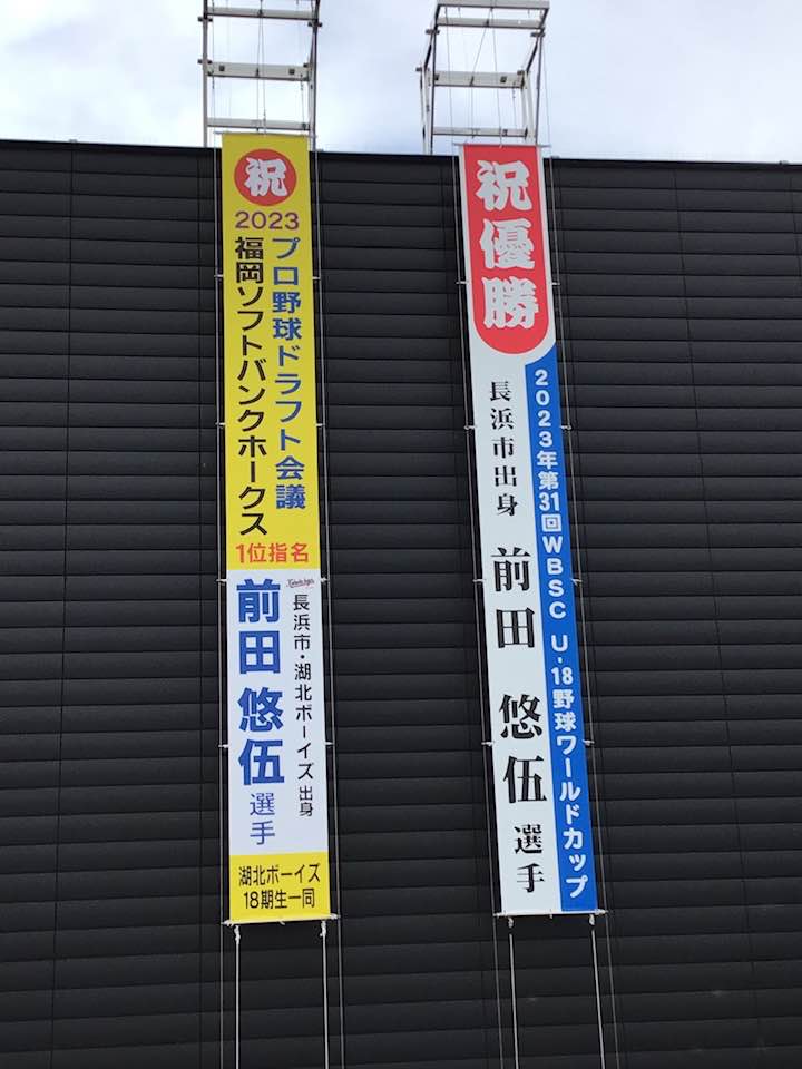 長浜市役所に掲げています。ドラフト一位の垂れ幕は、湖北ボーイズの同期生が作られました。同期の誇りですね。前田選手が正式契約し、ソフトバンクホークスの一員として、故郷長浜に帰ってきてくれることを心待ちにしています。今年は、阪神が日本一となり、「虎姫」のある長浜は慶賀が続きました