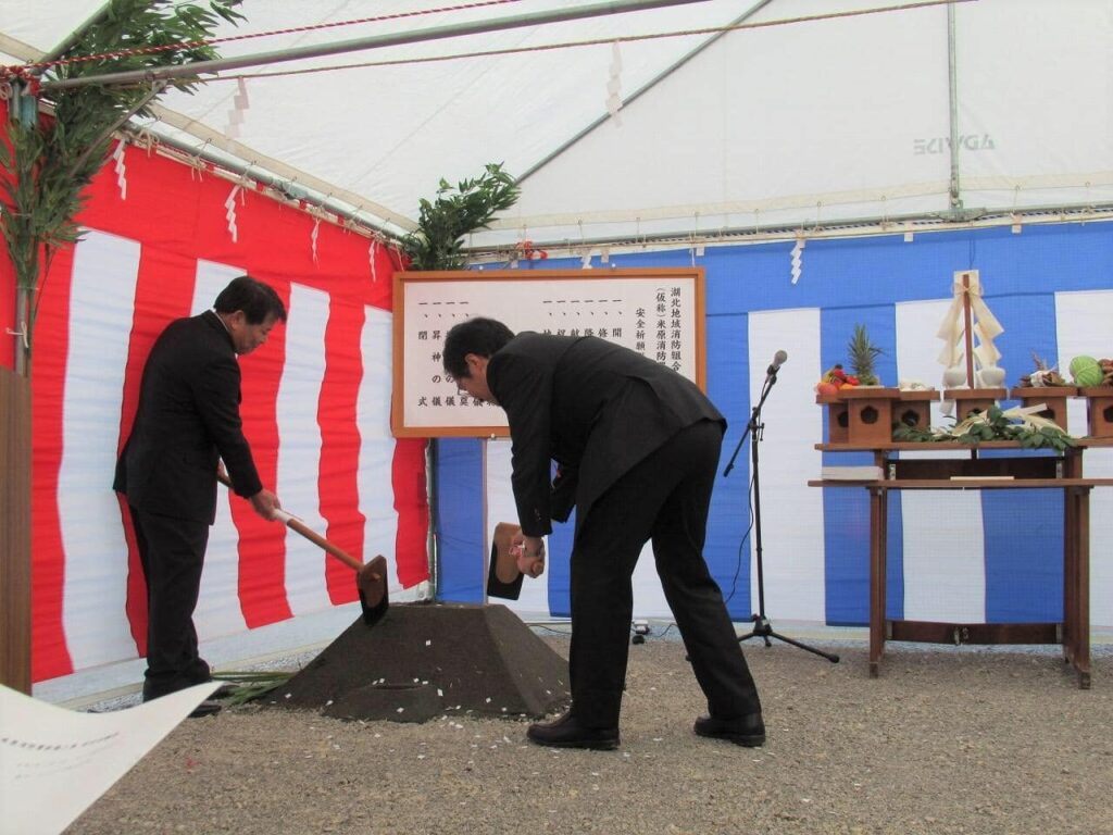湖北地域消防組合の(仮称)米原消防署とその米原出張所の安全祈願祭と合同起工式が行われました。いずれの署所も老朽化し、建て直しが望まれていたものです。長浜市と米原市の各市長、各議員(消防議会議員となっている議員)のほか、請負業者、地権者などが参加して、消防署所の工事について、安全を祈願し、かつ工事の開始を祝いました。