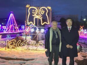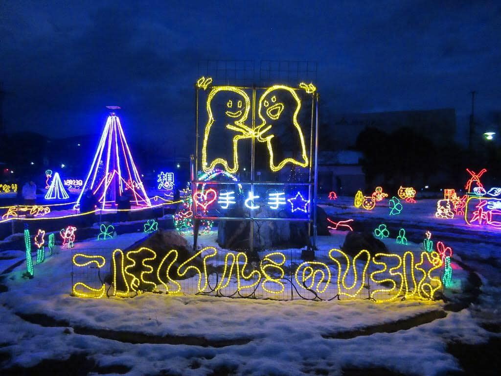 長浜市湖北町速水の湖北支所西広場(国道8号線沿い)で地域住民手作りのイルミネーションが点灯しました。とても綺麗です。国道8号線沿いなので、イルミネーションに気を取られて車の運転を誤らないようにお願いします。