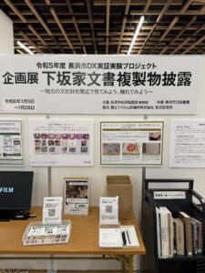 長浜市のさざなみタウンの長浜図書館で、DX実証実験として、富士フイルムの協力を得て作成した古文書の複製品を展示しています。古文書の複製品を撮影すればスマホに詳しい解説が表示され、びっくり