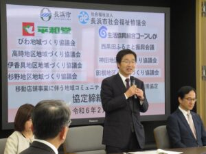 長浜市では、コープしがが過疎地域である余呉、上草野地域に移動販売車を走らせてくれています。特に高齢者に大好評です。今回、コープしがと株式会社平和堂の協力を得て、移動販売車の回る地域を7地域に拡大する協定が締結できました。地域づくり協議会、社会福祉協議会、長浜市の担当課も尽力してくれました。皆さんに感謝です。皆んなが協力してとても良いシステムができたと心から喜んでいます。嬉しいです。