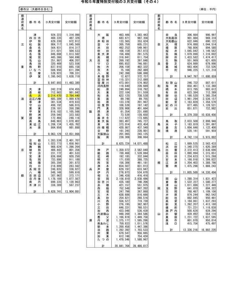少し遅くなりましたが、令和5年度の特別交付税額が総務省から発表されています。長浜市は、27億8,444万円の交付額で前年度より、1,409万7千円の増です。交付総額の全国順位は14位です。滋賀県では1位です。自主財源を強化していくことは重要ですが、併せて国からの財源確保も不可欠です。長浜市の立場を繰り返し国に説明し、国にもご理解をいただいたと思います。これからも引き続き財源確保に努め、市民のための市政を進めていきたいと思います。