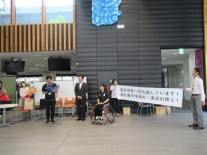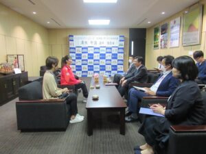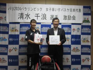 間もなく開かれるパリオリンピック・パラリンピックに、長浜市在住で唯一参加する清水千浪選手が長浜市役所を訪問してくれました。清水選手が出場するのはパラリンピック女子車イスバスケです。目標を聞くと、ズバリ金メダルと答えてくれました。頼もしいです。期待しましょう。最後は、市役所1階に市役所職員150人位が集まって、私が花束を送り、皆んなで清水選手を送り出しました。