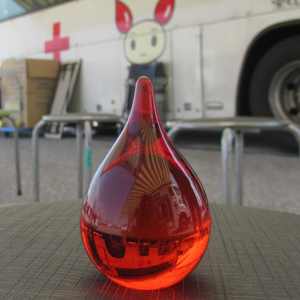長浜市では平成元年以来、市民による1000人献血運動があります。こうした運動もあって滋賀県の中でも献血量が多いのが長浜市です。お互いの助け合いが市民運動として行われているのは長浜市のシビックプライドといえます。これからもこうした運動を大事にしたいですね。若い人も是非献血にご協力下さい。なお、写真のガラス器は、献血の普及を願って以前黒壁で作られたものです。