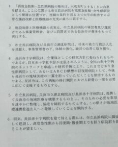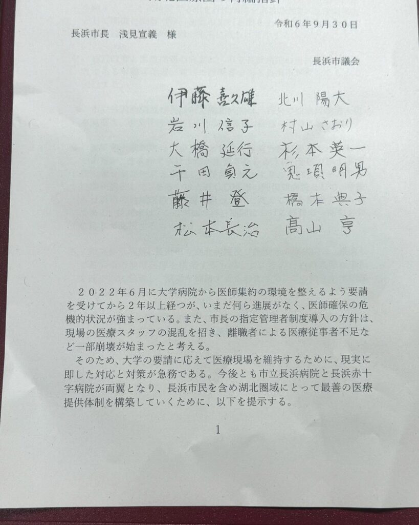 長浜市の焦眉の課題である病院再編について、市の病院再編方針に対して、市議会議員有志から対案(再編指針)が提出されました(2枚)。市は、市民、マスコミ、大学医学部等、滋賀県の関心が高いので、公開の上で、10月11日までに早急に説明会を開いてほしい旨お願いしました。提案議員からは、質問事項を出して欲しい旨の回答がありました。説明会が開かれれば、皆さんも是非ご参加ください。なお参考までに、市の「病院再編方針」、「再編方針の決定にいたる経緯」、「湖北の医療は新しいステージへ」(パンフレット)のアドレスをつけておきます。