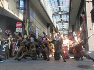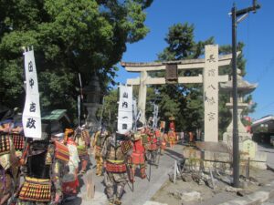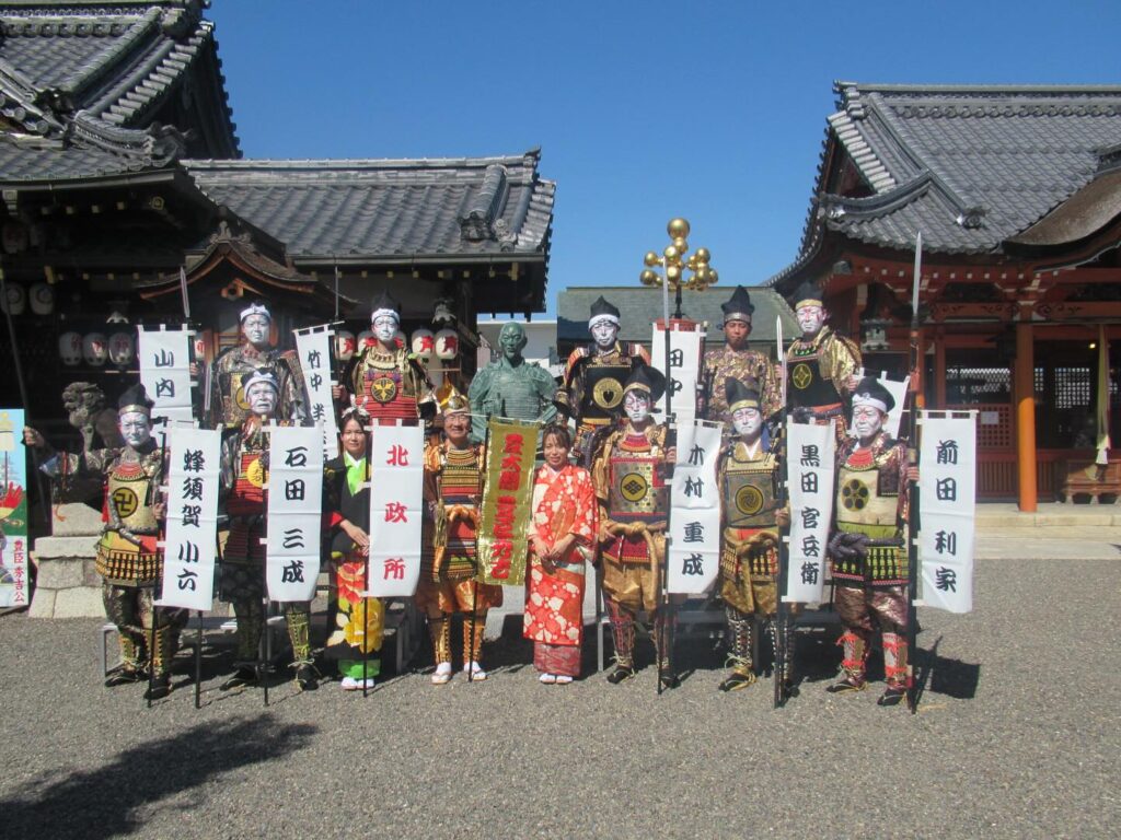 豊臣秀吉公によって城下町が築かれ、大いに栄えた長浜のまちは、秀吉公を敬い、時代的変遷はあったものの、豊国神社(ほうこくじんじゃ)を築き秀吉公を祀っています。豊国神社の豊公まつりでは、賤ヶ岳合戦の凱旋を表現した秀吉公や賤ヶ岳七本槍などの武者行列・稚児行列が行われます。私は毎年、秀吉公役をさせていただいています。今年は初めてセリフもいただきました。練習不足で気恥ずかしいのですが、