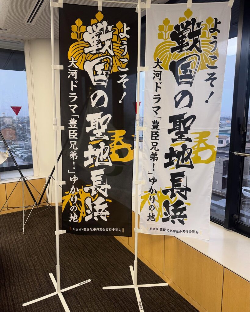 なお、写真は再来年に迫るNHKの大河ドラマ「豊臣兄弟」にちなむ長浜市のPRのぼり旗です。市長室にも立てています。来年はもっと数を増やしていきたいですね。