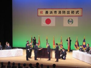 長浜市の消防関係者が一同に会しての出初式です。これが開催されると、身が引き締まる思いがします。気候変動のためもあり、ロサンゼルスの火災は大惨事になっています。日本でも最近火災が多いように感じます。先日、長浜でも亡くなった方がおられる火災がありました。こうした状況を踏まえると、消防関係者は、私も含めて、市民の安全安心のために尽力できるよう全力を尽くす必要があることを改めて確認すると共に、市民の皆さんも一人一人が防災意識を高めていただけるようお願い申し上げます。