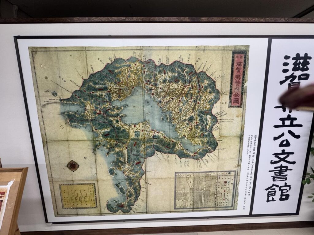滋賀県庁の中にある滋賀県立公文書館で見つけた地図です。福井嶺南地方の四郡が滋賀県の一部だった明治9年から14年の頃の滋賀県を描いたものです。この通りなら、滋賀県、福井県の歴史もかなり変わったでしょうか。