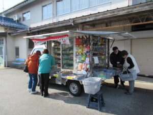 令和5年4月から長浜市で生協さん、平和堂さん、地域づくり協議会の協力を得て展開している移動店舗を視察し、買い物もしてきました。移動店舗は買い物支援とコミュニティの活性化に役立っています。当初は余呉と上草野の2地域でしたが、今は、びわや西黒田などを加えて9地域となっています。長浜市は、このシステムの定着、拡張を考えています。視察では、お年寄りの笑顔