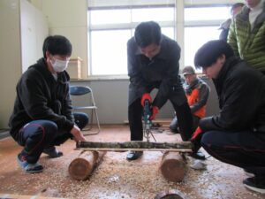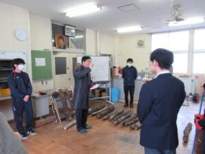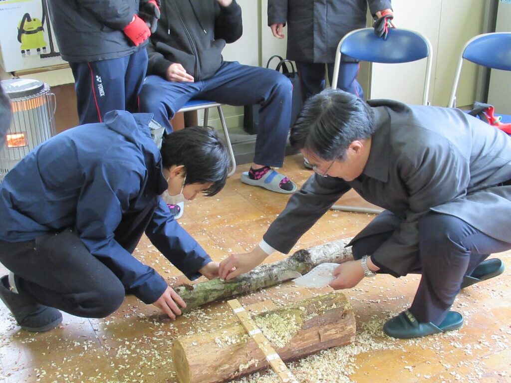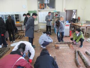 長浜市の伊香高等学校では、来年度普通科に森の探究科が設置され、全国募集(令和8年度入学分から)も始まります。長浜市も応援しています。新学科では「森で学ぶ」をキーワードに、林業だけでなく、自然環境や再生可能エネルギー、地域文化など幅広い内容を学びます。その内容に少しでも触れるため、現在の授業(2年自然環境コース)で、椎茸の菌を原木に埋め込む作業を見学し、私も作業をさせていただきました。初めての作業でしたが、とても興味深く、いつも食べるだけ、スーパーで買うだけの椎茸の生育や特徴に関心が湧きました。原木を日陰で世話して椎茸が育ってくるとさらに愛情が湧いてくるでしょうね。こうした教育は高校生に良き影響を与えると感じられました。中学生の皆さん、伊香高校の森の探究科を宜しく