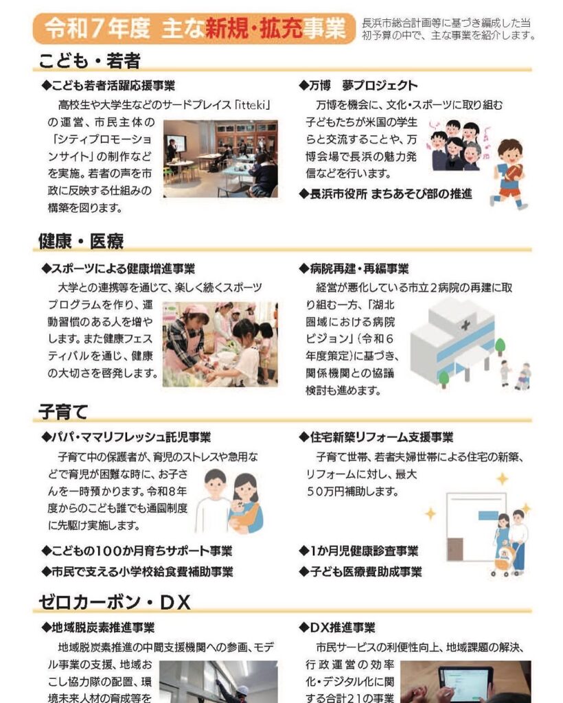今年度も各分野で、長浜市が元気になる改革を進めます。万博夢プロジェクト、スポーツによる健康増進事業、パパ・ママリフレッシュ託児事業、DX推進事業、北近江豊臣博覧会開催事業、南長浜まちづくり推進事業など目白押しです。