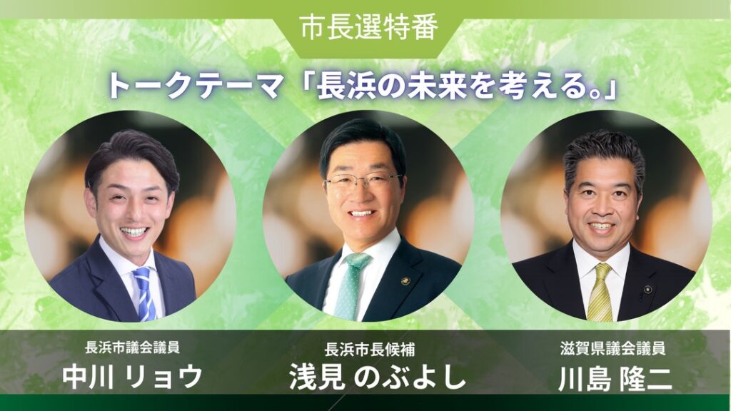 選挙戦最後の夜を迎える今宵、長浜市長候補 浅見のぶよし 、滋賀県議会議員 川島隆二 、そして中川リョウ の3人でYouTubeライブ配信を行います。