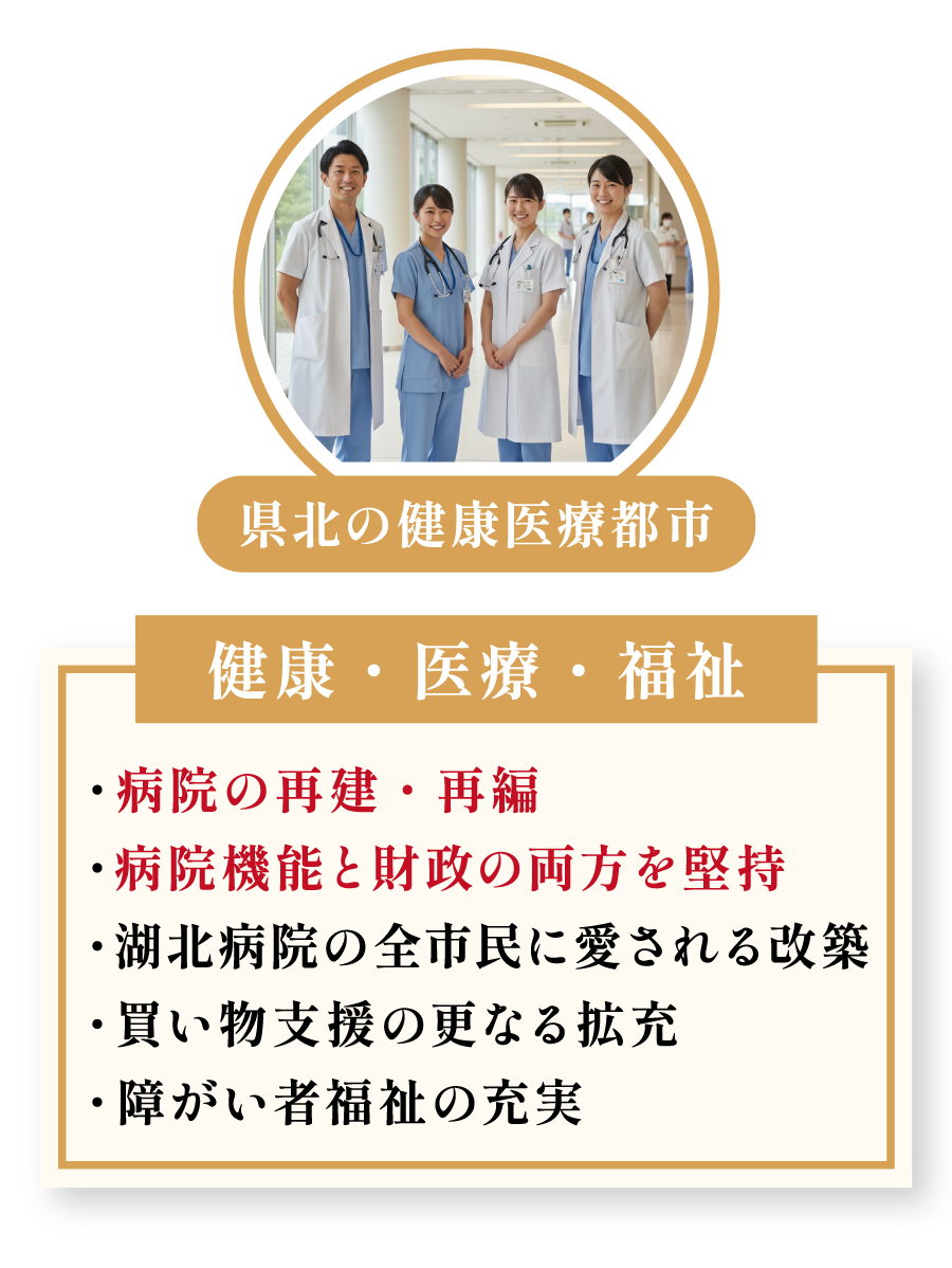 市民の命と健康を守るため、病院の再編・再建を着実に進めます。病院の機能と財政を守りながら、特に湖北病院については、すべての市民に愛され、信頼される病院となるよう改革を進めます。また、高齢者の暮らしを支える買い物支援事業も、さらに拡充していきます。