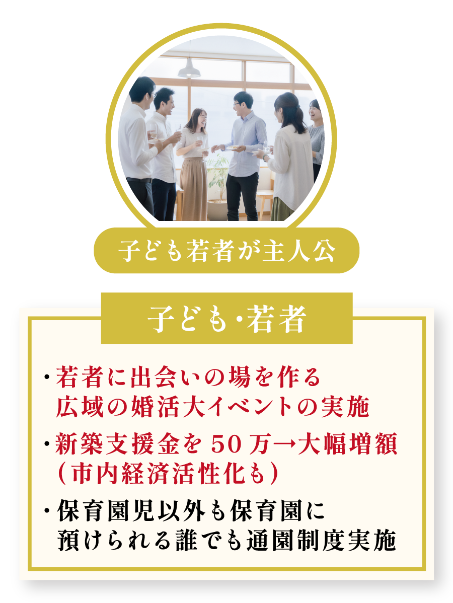 若者世代が長浜に定住し、家庭を築くための支援を強化します。出会いの機会を創出するため、広域連携による大規模な婚活イベントを実施。また、若者や移住者がマイホームの夢を実現できるよう、住宅の新築支援金を50万円から大幅に増額し、経済的な基盤づくりを力強く後押しします。
