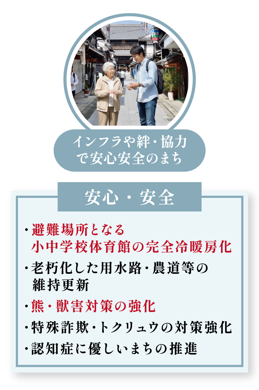 災害時にも市民の命を守れるよう、避難所となる小中学校体育館の完全冷暖房化を推進します。また、近年深刻化する熊などの獣害対策や、特殊詐欺・闇バイトといった新たな犯罪への対策を強化。高齢者が安心して暮らせる、認知症に優しいまちづくりも進めます。