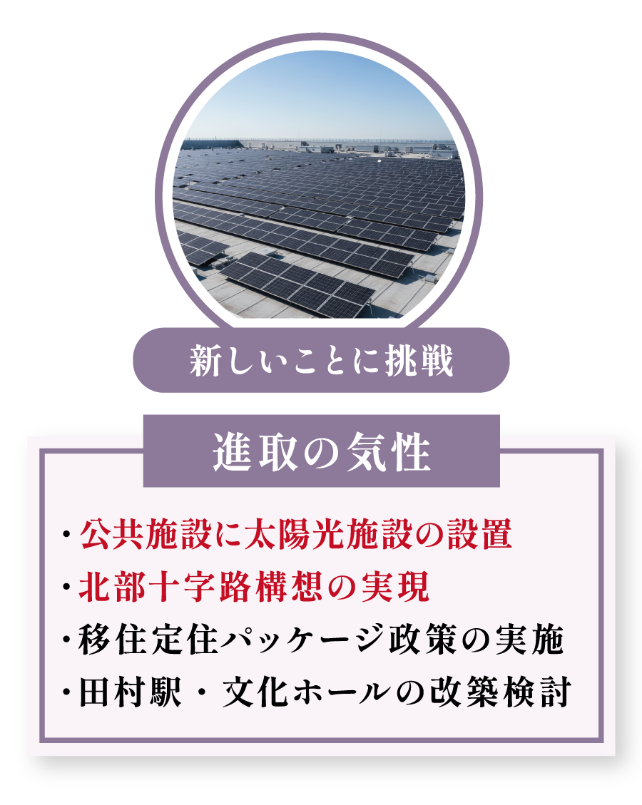 未来への投資を惜しまず、挑戦を続けます。公共施設への太陽光パネル設置による脱炭素社会への貢献や、長浜の交通網を革新する「北部十字路構想」の実現、そして若者や新しい住民を呼び込むための移住パッケージ政策の実施など、常に未来を見据えたまちづくりを進めています。