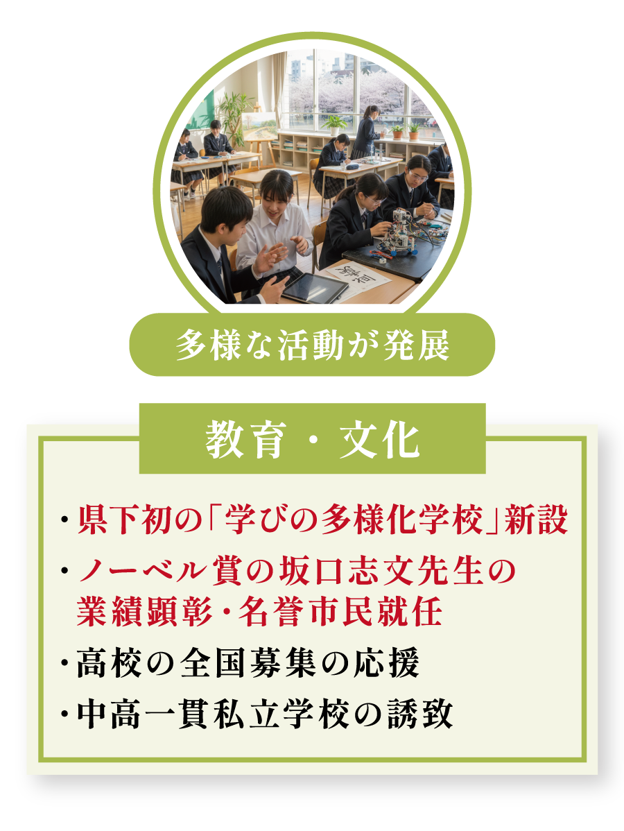 誰一人取り残さない教育環境を整備します。県下初となる「学びの多様化学校」を新設し、様々な事情を抱える子どもたちの学びの場を確保。また、高校の魅力を高め、全国から生徒を呼び込むための応援や、将来を見据えた中高一貫校の誘致も積極的に進めます。