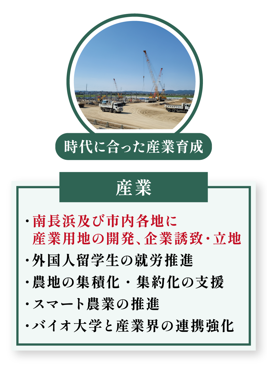 企業の新たな挑戦を支え、力強い産業のまちを創ります。米原市と協力して南長浜に新たな産業用地を開発し、優良企業を誘致。また、農地の集積化・集約化を支援し、意欲ある担い手を育成します。さらに、長浜バイオ大学と産業界の連携を強化し、地域から新しいビジネスを生み出します。
