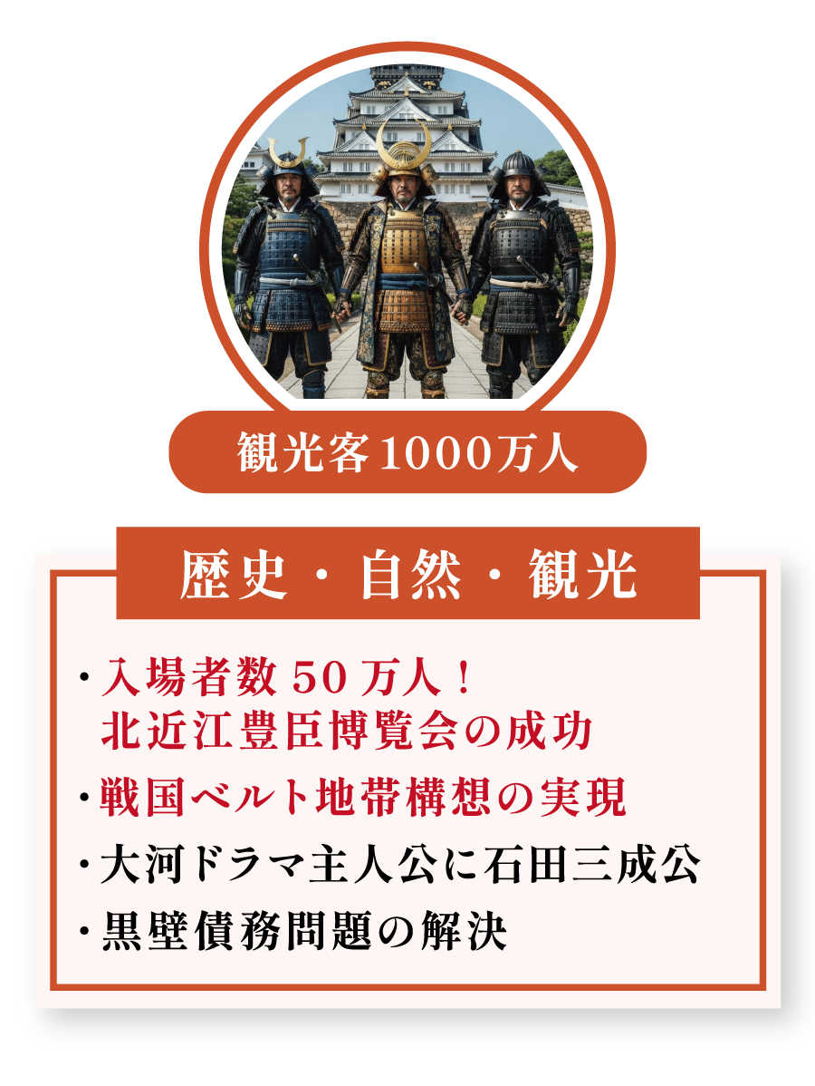 目標入場者数50万人を掲げる「北近江豊臣博覧会」を成功させ、長浜の歴史的魅力を全国に発信します。さらに、点在する史跡を繋ぐ「戦国ベルト地帯構想」の実現や、懸案である黒壁の債務問題を完全に解決することで、何度も訪れたくなる周遊・滞在型の観光地を目指します。