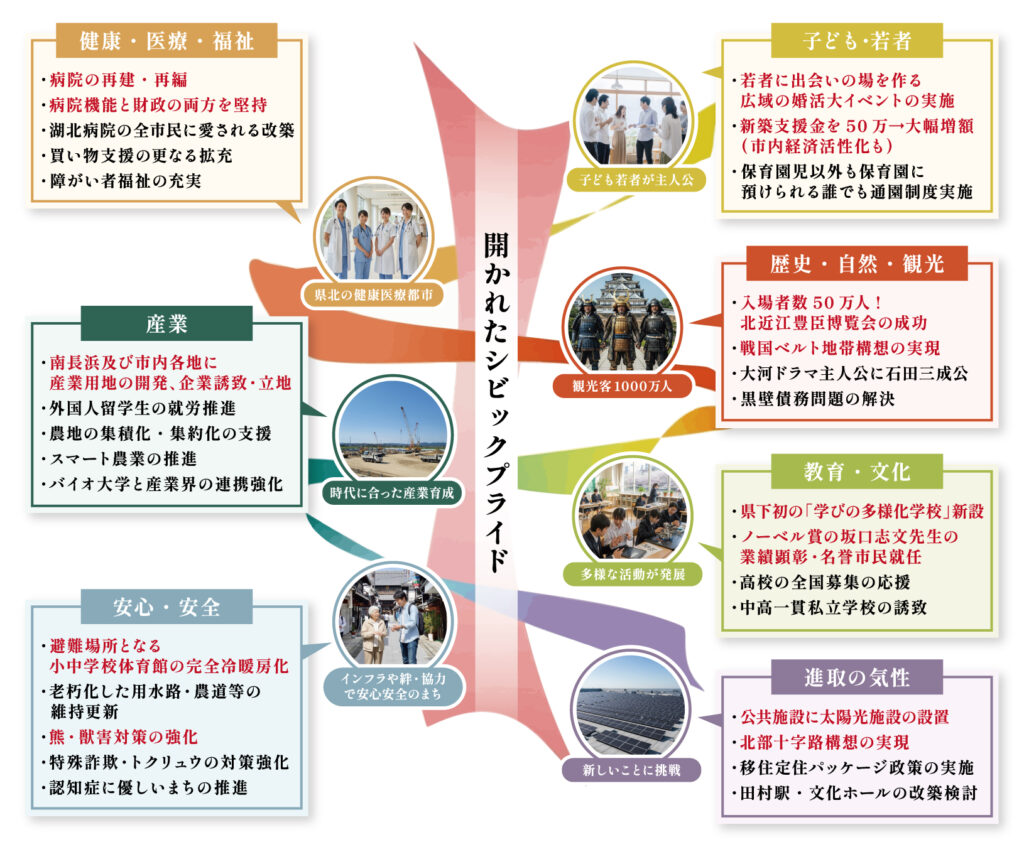 これまでの改革で築いた土台の上に、人口減に負けず長浜の未来を一段と輝かせるため、7つの分野に重点を置いて改革をさらに進めます。市民一人ひとりが主役となり、夢と希望を持てる新しい長浜を、皆様と共に創り上げていきます。